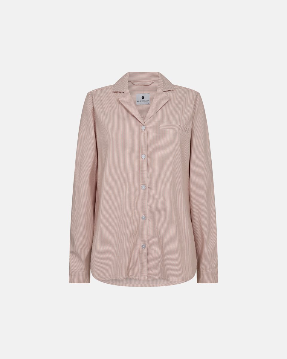 Forestil dig en morgen, hvor komfort møder stil - hvor du kan glide ind i dagen med den blødeste berøring mod huden. Vores langærmede pyjamasskjorte i ferskenfarvet strib, fremstillet fra en luksuriøs blanding af bambusviskose, bomuld og et strejf af elastan, er designet til netop dette. Bambusviskosen giver en naturlig blødhed og åndbarhed, der føles behagelig gennem hele dagen og natten, mens bomulden tilføjer en følelse af robusthed og holdbarhed. Denne pyjamasskjorte er ikke bare behagelig; den er også skabt med omtanke for både dig og miljøet. Enkelthed og funktionalitet går hånd i hånd med et diskret, men elegant design, der afspejler den nordiske tilgang til mode - minimalisme uden at gå på kompromis med kvalitet. Så uanset om din dag starter roligt med en kop te i morgensolen eller efter en lang, travl dag, er denne pyjamasskjorte den perfekte ledsager, der sikrer, at du altid har det godt, både indeni og udadtil.