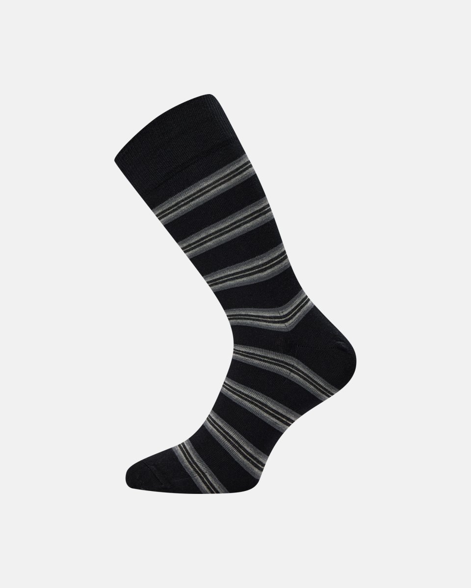 Egtved, grundlagt 1931, leverer strømper hvor kvalitet og komfort går hånd i hånd. 80% bomuld og 20% polyamid giver en blød og åndbar fornemmelse med ekstra elasticitet og holdbarhed. Sorte strømper med vandrette striber i nuancer af grå; mønstret af bredere og smallere striber skaber et klassisk og alsidigt udtryk. En ribkant øverst sikrer tæt pasform omkring læggen, mens materialeblandingen bevarer formen gennem daglig brug. Designet fungerer lige godt til formelle lejligheder som til afslappet hverdag.