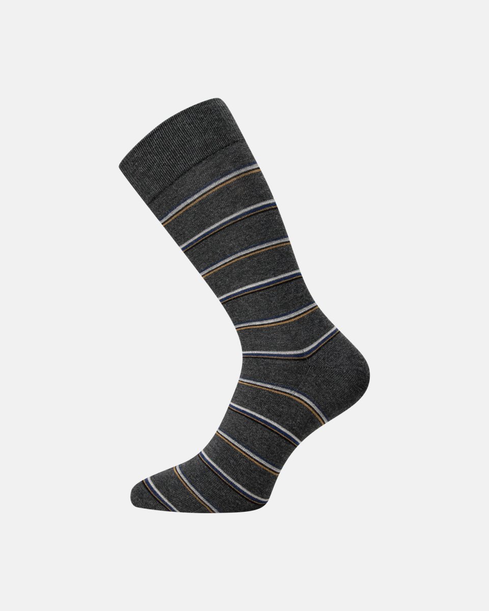 Egtved kombinerer håndværk og kompromisløs kvalitet siden 1931. Strømperne er fremstillet af 71% viskose (bambus) og 29% polyamid, hvilket giver en blød, åndbar og smidig pasform gennem hele dagen. Mørkegrå bund med jævnt fordelte vandrette striber i lyseblå, hvid og lysebrun tilfører et diskret, moderne udtryk. Elastisk sokbånd holder strømperne på plads uden at stramme, og forstærkede syninger ved hæl og tå øger holdbarheden. Et enkelt valg for den, der prioriterer komfort, materiale og stil.