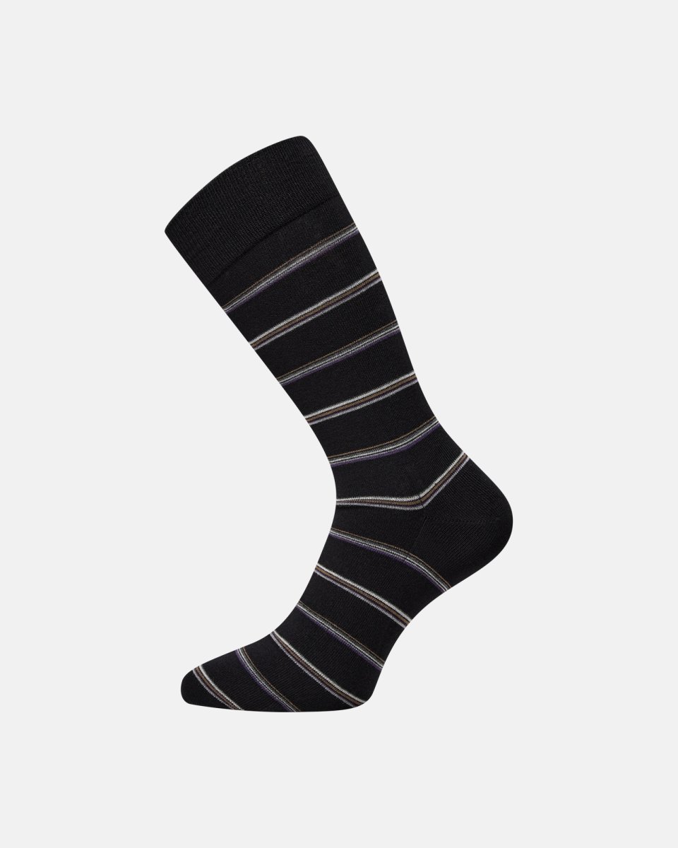 Egtved forener stolte håndværkstraditioner fra 1931 med moderne materialer i denne herrestrømpe. 71% viskose (bambus) giver en blød, glat og åndbar overflade, mens 29% polyamid sikrer holdbarhed og formstabilitet. Sort grundfarve med jævnt fordelte horisontale striber i hvid, grå og en diskret lilla tone. Bred elastikkant holder strømperne på plads uden at stramme. Fin finish og styrket tråd i belastede områder gør dem velegnede til både formelle lejligheder og hverdag.