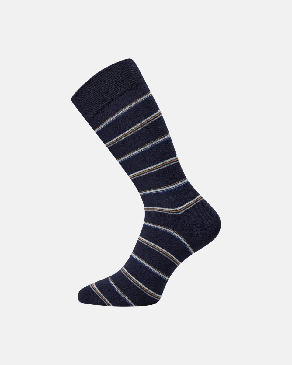 Egtved kombinerer håndværk og kvalitet siden 1931. Herrestrømpe i dyb navy med klassiske horisontale striber i lysegrå og lyseblå adskilt af fine hvide linjer. Blød, åndbar kvalitet med 71% viskose (bambus) og 29% polyamid, der giver naturlig glans og behagelig pasform. Strømpen er strækbar og sidder tæt uden at stramme. Ribkant sikrer, at den bliver på plads, og forstærket hæl og tå giver ekstra holdbarhed. Velegnet til både hverdag og mere formelle anledninger.