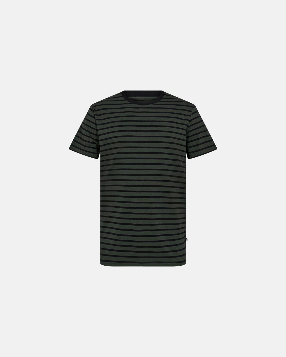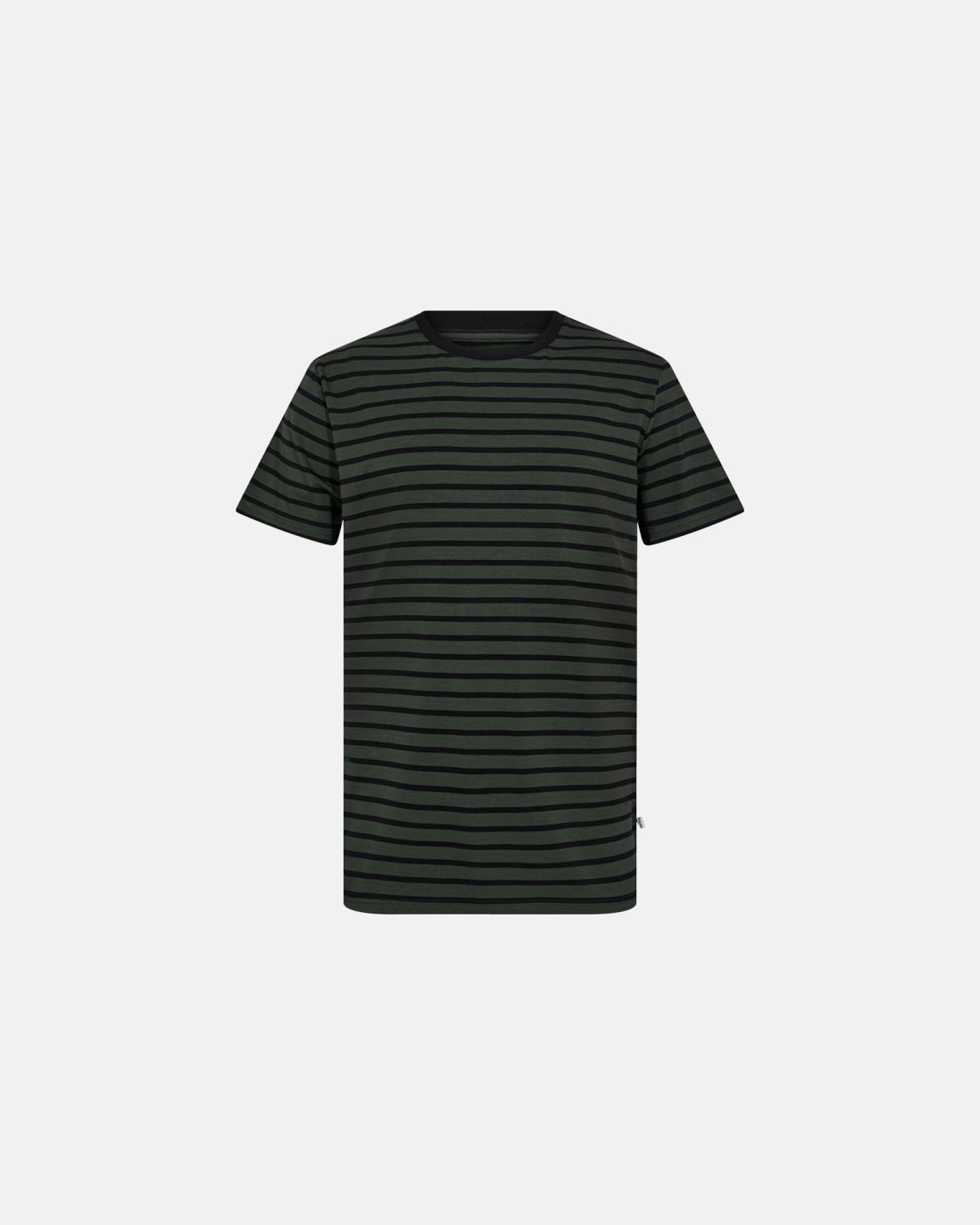 Enkel og ligetil o-neck T-shirt i bambusviskose med korte ærmer, uden unødvendige detaljer. 65% bambusviskose, 30% bomuld og 5% elastan sikrer en blød overflade, naturlig temperaturregulering og diskret stretch. Vandrette striber i mørkegrøn og sort skaber et klassisk udtryk, mens den sorte halskant og den småt diskrete mærkeflap understreger det gennemførte men ubesværede design. Stoffets lette struktur sikrer åndbarhed og komfort fra morgen til aften. T-shirten er skåret til med fokus på bevægelsesfrihed og passer til alle hverdagssituationer.