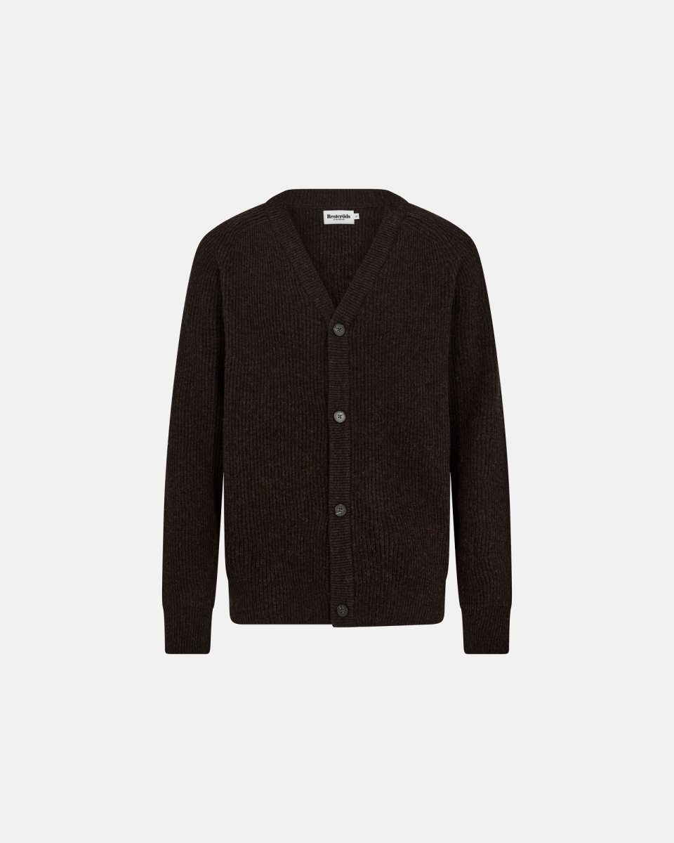 Resteröds har lavet strik siden 1935, enkelt, ærligt og praktisk. Brun V-udskæring cardigan med fire knapper foran, ribbet tekstur og ribkanter ved ærmer og bund for en pæn finish. 80% uld og 20% polyamid: ulden giver varme og blødhed mod huden, polyamidet øger holdbarhed og hjælper med at bevare formen. Varm og komfortabel, velegnet til køligere vejr. Moderne pasform til herre.