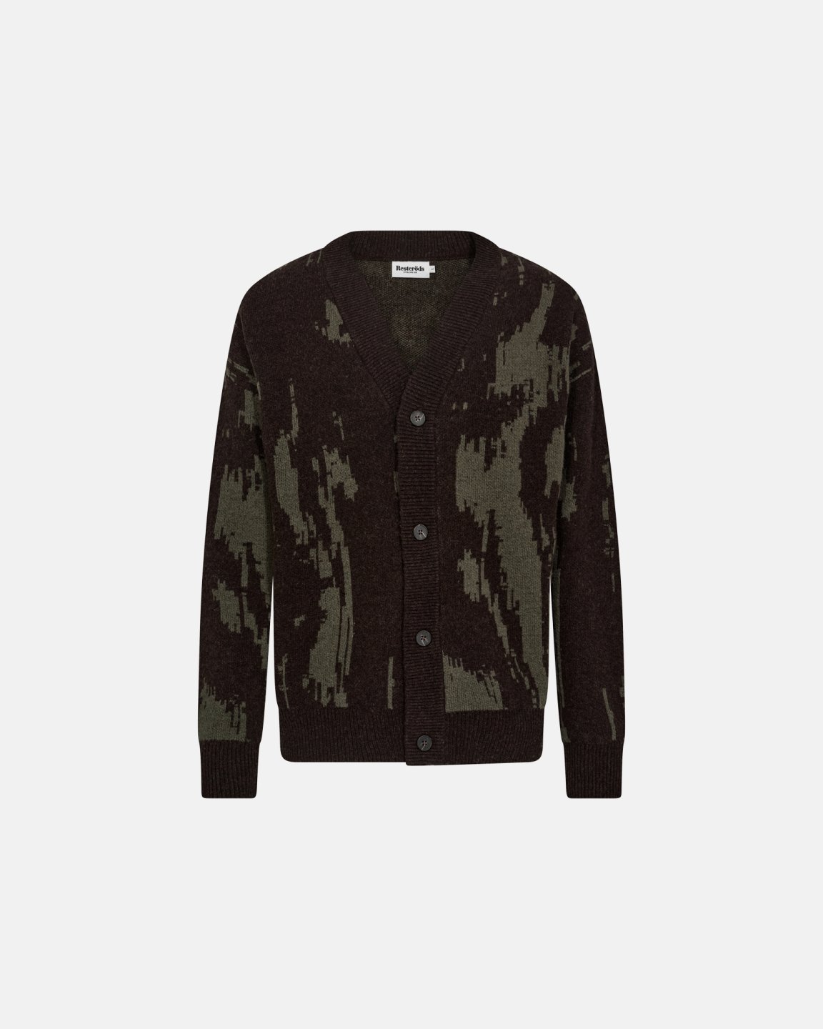 Cardigan 'Jack' er skabt med fokus på autentisk håndværk og ærlige materialer. Den mørkebrune og grønne kombination danner et roligt camouflageinspireret mønster. 80% uld og 20% polyamid giver naturlig varme, holdbarhed og en blød fornemmelse. Ribkanter ved hals, manchetter og bund sikrer fleksibel pasform. De fire mørke knapper foran gør den enkel at lukke. Cardiganen holder dig varm på kølige dage uden at føles tung. Passer til en tidløs garderobe.