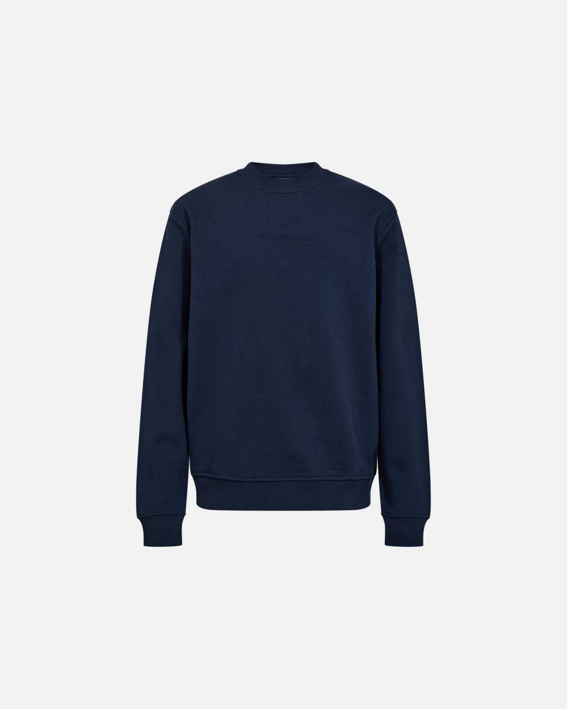 Denne navy sweatshirt i 100 % økologisk bomuld giver dig en blød og åndbar fornemmelse hele dagen. Den runde hals og ribkanter ved ærmer og bund sikrer en tæt og behagelig pasform uden at stramme. Det glatte stof falder naturligt og fremhæver et enkelt, nordisk look. Den diskrete tone-i-tone brodering på brystet tilføjer et stilrent touch uden at stjæle fokus. Med denne klassiske sweatshirt får du komfort og ansvarligt design samlet i ét.