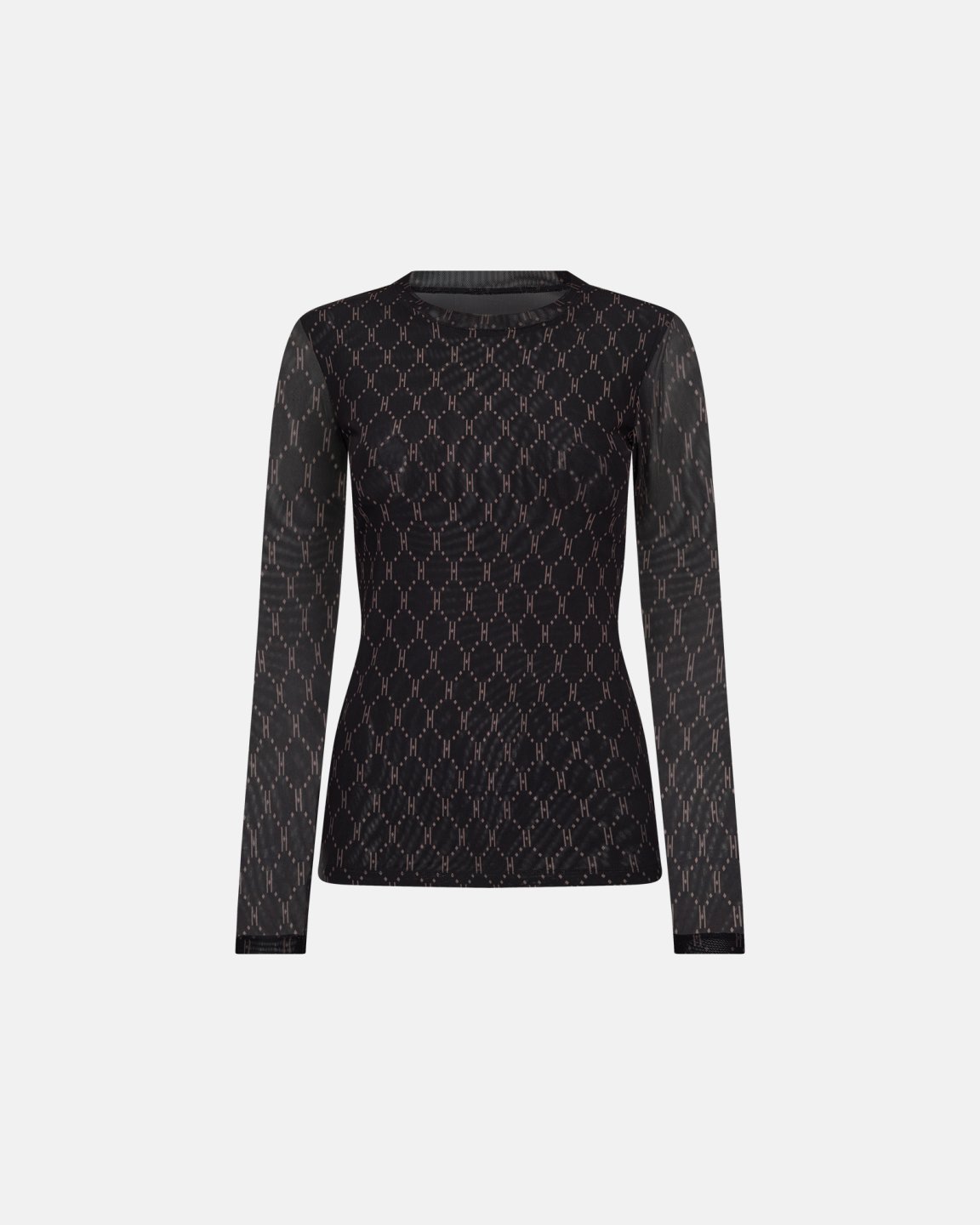 Sort meshbluse – Grafisk og feminin - i let, åndbart polyester med elastan for en tætsiddende og behagelig pasform. Semi-transparente H-logoer i geometriske mønstre giver en skinnende kontrast og fremhæver bevægelse. Rund hals og lange ærmer skaber et klassisk snit med et moderne twist. Brug den til jeans og sneakers, eller style den under en blazer. Perfekt alene for et statement-look – eller med en bandeau-top for mere dækning.