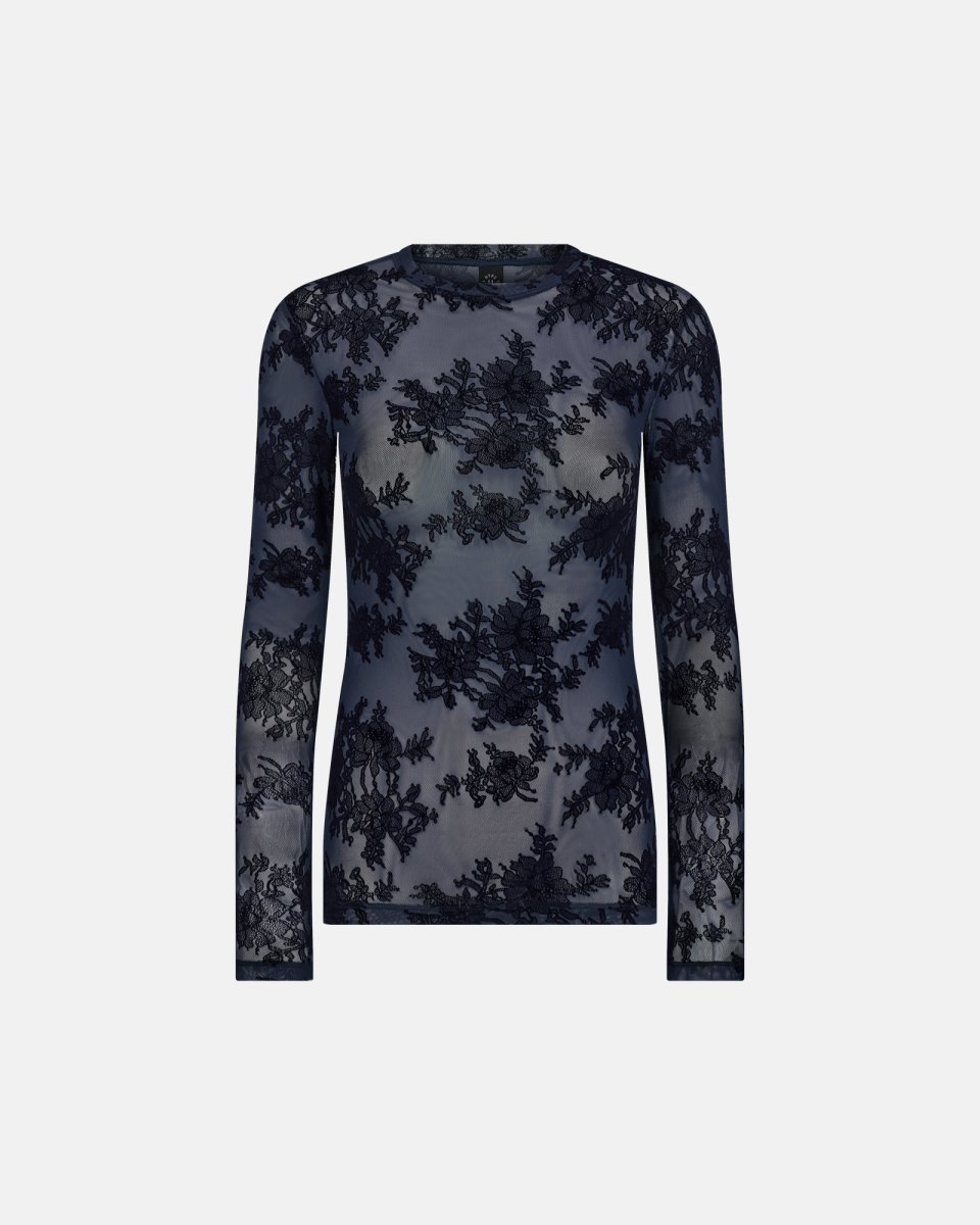 Nu kan du give dit hverdagslook et twist med en gennemsigtig navy mesh-bluse udsmykket med mørkeblå blomsterblonde. Det tætsiddende snit og rund hals fremhæver dine feminine træk, mens det lette materiale føles åndbart og superkomfortabelt hele dagen. Den bløde elastan sikrer optimal bevægelsesfrihed, så du ubesværet kan style med både sneakers til afslappede dage eller stilethæle til fest. De detaljerede blondeapplikationer hylder romantik og nytænkning – perfekt til dig, der elsker at lege med kontraster. Brug den alene for et sofistikeret touch eller som lag-på-lag med en fin blazer for et personligt og moderne udtryk. Kombinationen af kvalitet og små magiske detaljer får dig til at skinne fra morgen til aften.