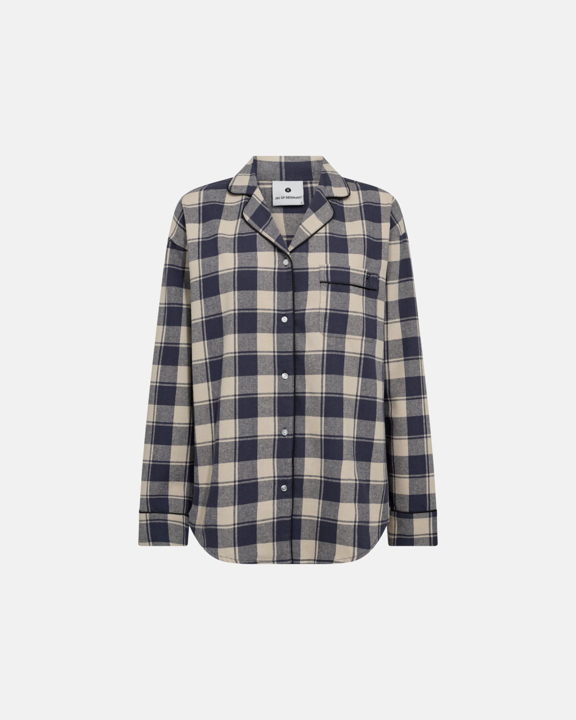 Opdag ro og komfort med vores gråternede pyjamasskjorte, designet til at give dig en blød og tryg nattesøvn. Den er lavet i 100% økologisk bomuld, der ånder naturligt og føles let mod huden. Det klassiske skotskternede mønster i beige og mørkeblå tilføjer et diskret touch af nordisk tidløshed. Den traditionelle krave og de sorte pipingdetaljer langs kanter og brystlomme tilfører et elegant, men afslappet udtryk. Med lange ærmer og en løs pasform bevæger du dig ubesværet – perfekt til både hygge og hvile. Blød flannelagtig tekstur sørger for, at du kan slappe af med selvtillid og velvære.