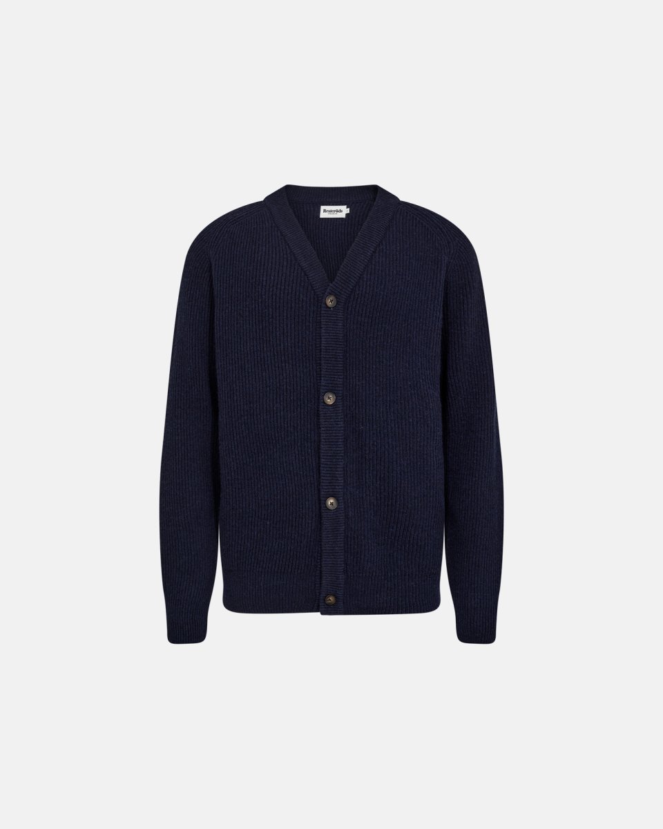 Resteröds har lavet praktisk og ærligt strik siden 1935. Kyle er en mørkeblå, ribstrikket cardigan til mænd med V-hals og fire matchende knapper. Materialet er 80% uld og 20% polyamid; ulden giver varme og åndbarhed, polyamid sikrer styrke og formstabilitet. Ribmønsteret giver tekstur og bevægelsesfrihed, og ribkanter ved manchetter og bund holder pasformen. Blød uden at være tung, enkel til både hverdag og mere formelle anledninger.