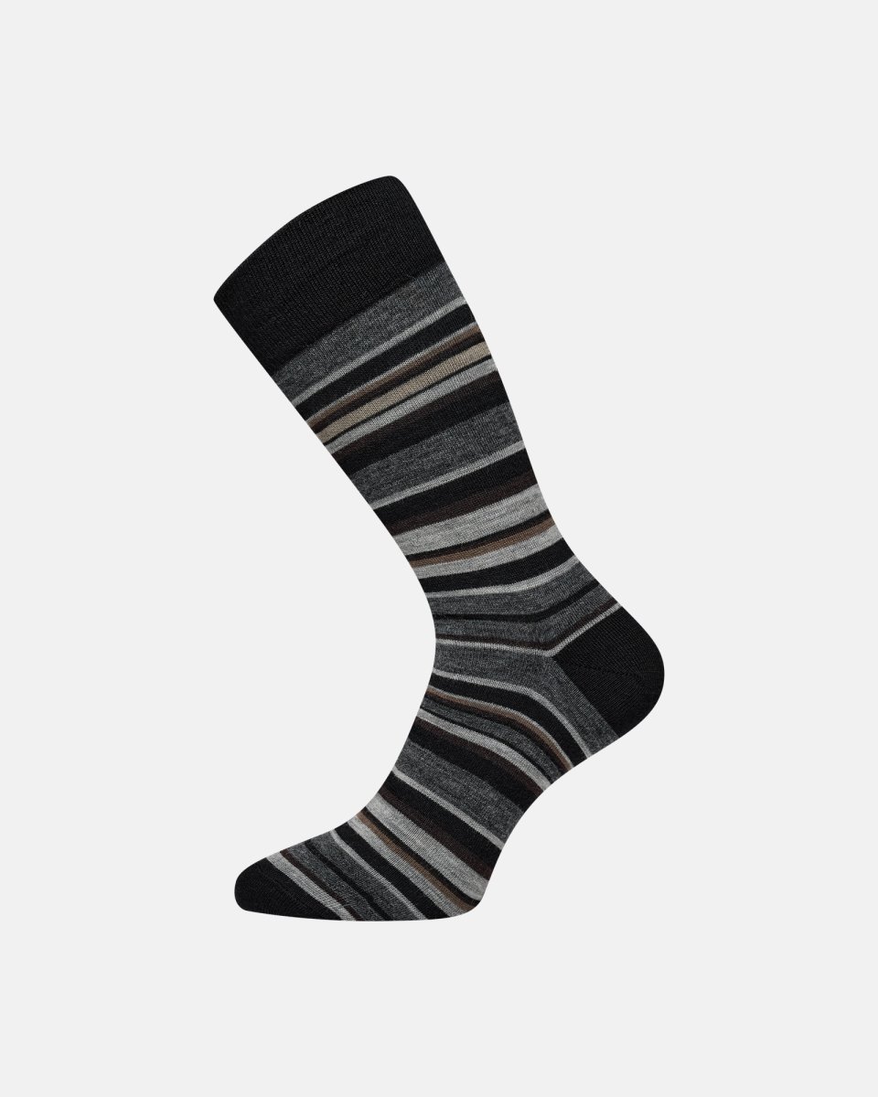 Egtved står for håndværk og kvalitet siden 1931. Strømper i 75% uld og 25% polyamid giver naturlig varme, god fugttransport og komfort hele dagen. Mønstret med diskrete vandrette striber i sorte, grå og brune nuancer tilføjer subtil stil uden at være påtrængende. Ribbet top sikrer stabil pasform, og forstærket hæl og tå øger slidstyrken. Velegnet til både hverdag og mere formel påklædning.
