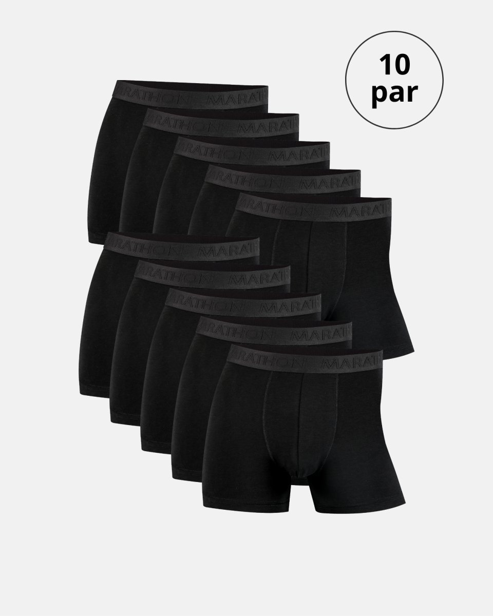 Marathon fokuserer på enkel, robust komfort til hverdag og træning. Denne 10-pak sorte tights i 65% bambusviskose, 30% bomuld og 5% elastan er blød mod huden og åndbar. Elastisk linning med prægede MARATHON-logo giver en sikker pasform uden at stramme. Den sorte farve er neutral og nem at kombinere med resten af garderoben. Bambusviskoseblandingen absorberer fugt og føles kølig mod huden, mens elastan sikrer fleksibilitet og fastholder formen. 10-pakken gør det praktisk ved hyppig vask og daglig brug.