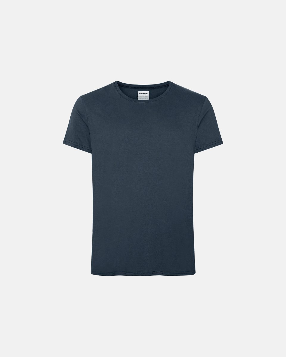 Kortærmet t-shirts i flot enkelt navy design fra det svenske mærke Resteröds. Resteröds er kendt for sin kærlighed, sjæl og erfaring som med garanti også er tilført denne simple, behagelige og flotte t-shirt. T-shirten er i lækker bomuldskvalitet som sikrer brugeren god behag og god komfort.Modellen på billedet er 180 cm høj, vejer 78 kg og bruger størrelse M.På billedet ses også et par Resteröds jeans.Produceret i 100% bomuld.