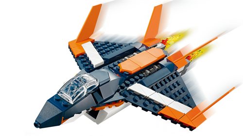 BeskrivningKids aged 7 and up can enjoy thrilling playtime action high in the sky or on the water with this fantastic LEGO® Creator 3in1 Supersonic-jet (31126) building toy. It features a superfast air race jet with a cockpit, retractable wheels, flames shooting from the engine and a stand for display. LEGO toys for imaginative play LEGO fans who love fast-paced action have 3 different authentic models to build and play with in this LEGO Creator 3in1 set. They can build a jet plane toy, then rebuild it into a helicopter or a speed boat, or use the 215 bricks to create their own cool vehicle. A digital experience for LEGO builders The toy set comes with interactive digital building instructions to make the building experience even more fun. Available in the LEGO Building Instructions app for use on smartphones and tablets, the zoom and rotate tools help kids visualize the model as they build. 3in1 toy – Kids can indulge in creative fun with the LEGO® Creator 3in1 Supersonic-jet (31126) building set, featuring 3 models in 1: a jet plane, a helicopter and a powerboat Unlimited playtime – LEGO® fans can perform stunts in the air with the jet plane and the helicopter and race on the water with the powerboat Authentic features – The Supersonic-jet has a cockpit, angled wings and retractable wheels, while the helicopter has rotating blades and the powerboat features 2 superfast engines A quick build – Kids aged 7 and up can enjoy a quick and easy build with this 215-piece set before playing out stories with the 3 different vehicles Portable size – The Supersonic-jet measures over 3 in. (8 cm) high, 10.5 in. (27 cm) long and 6 in. (16 cm) wide, to allow kids to play with it at home or take to a friend’s house More 3in1 fun – Look out for other new-for-March-2022 LEGO® Creator 3in1 sets including Super Robot (31124), Fantasy Forest Creatures (31125) and Off-road Buggy (31123) Interactive digital building – Using the LEGO® Building Instructions app, builders can zoom, rotate and visualize a digital version of their model on their smartphones and tablets Premium quality – For more than 6 decades, LEGO® bricks have been made to ensure they pull apart consistently every time Safety assurance – LEGO® building bricks meet stringent global safety standardsIndhold 0Specifikationer:Ingredienser:PlasticVegansk:26,2 cmSockerfri:4,6 cmSöthetsnivå:7+