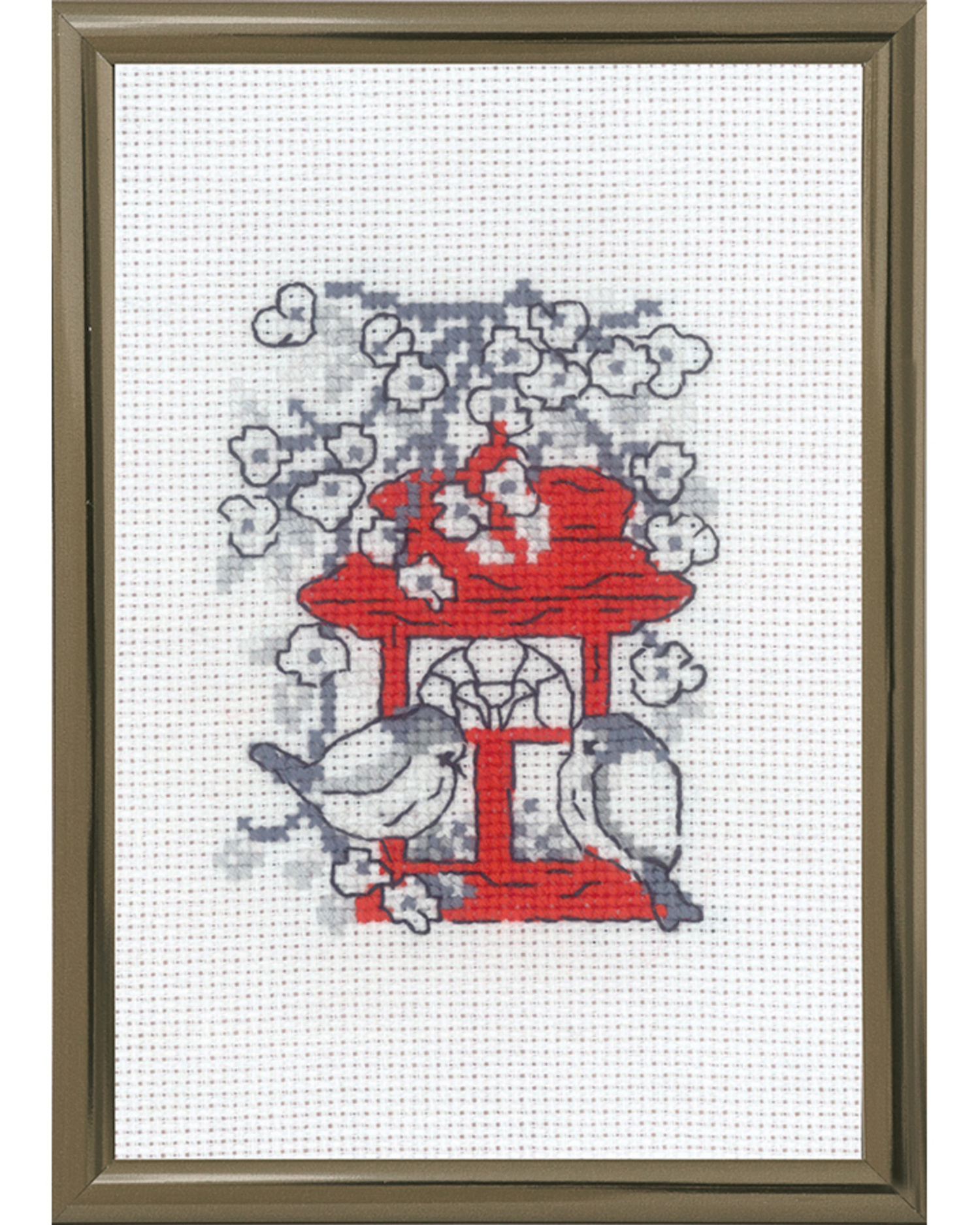 Lille billede med smukt motiv af et foderbræt til småfugle. Et smukt broderi som vil give mange hyggelige timer med synålen Pakningen indeholder: broderistof, mønster, nål og garn Materiale: Syet på Aida 6,4 hvid Teknik: Korssting 2/6 tråd og stikkesting 1/6 tråd Garn: 2 farver DMC Mouliné Størrelse: 10 x 15 cm