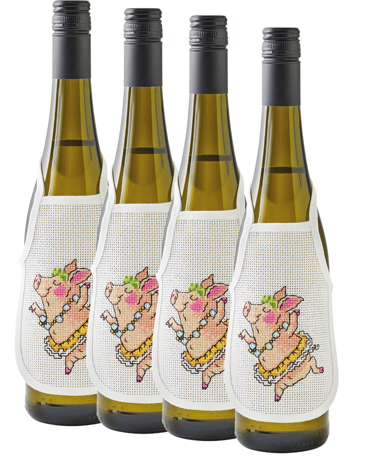 Indeholder: nål, garn, mønstre, Inklusiv 4stk færdigmonteret flaskeforklæder, Broderet med korssting med delt garn 2/6 tr. Stikkesting med 1/6 tr. Syet på Aida færdig vare.