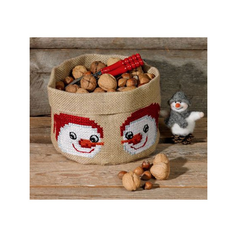 Julekurv med snemænd En smukt og traditionelt julekurv, som vil give mange hyggelige timer med broderinålen. Broderes med korssting og stikkesting 2/4. Pakningen indeholder: broderistof, mønster, nål og broderigarn Materiale: Jute natur 583 3,9 tråde pr. cm Garn: 5 farver acrylgarn Størrelse: Ø21 x H15 cm