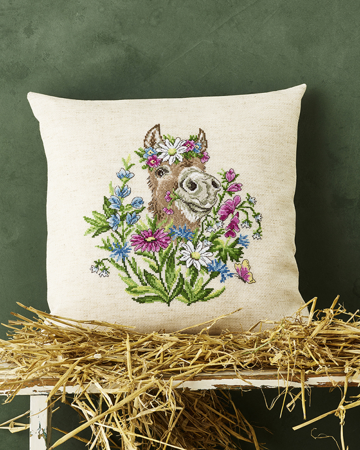 Broderet med DMC Moulinégarn. Korssting (2 deltråde) og stikkesting (1 deltråd) Syet på Aida 357/50 (natur) Incl. bagstykke til pude.