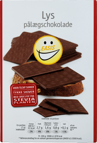 40% kakao.Med sötningsmedel från steviaplantan.EASIS Light Chocolate Spread är till för dig som gillar goda, tjocka skivor mjölkchoklad på brödet, men som vill spara på socker.Den innehåller inget tillsatt socker och 81% mindre socker än ett traditionellt lätt chokladspread. Chokladsmeten är sötad med det kalorifria sötningsmedlet erythritol och sötningsmedlet steviolglykosid, som utvinns ur steviaväxten. Njut av den på en bit bröd på morgonen eller som ett gott mellanmål.Mjölkchoklad med min. 40 % kakaohalt. Innehåller sötningsmedel. Utan tillsatt socker, men med ett naturligt sockerinnehåll. Sötad med det kalorifria sötningsmedlet erytritol och sötningsmedlet steviolglykosid, som utvinns ur steviaplantan.Lagring: Torrt och inte i solljus.Nettohalt: 112 g (16 portioner à 7 g).1 portion à 7 g innehåller34 kcal2,7 g fett1,4 g kolhydrater2,1 g kostfiber0,5 g protein Kakaosmör, kostfiber (oligofruktos), kostfiber (inulin), kakaomassa, söttMELK-pulver, sötningsmedel (erytritol 7,5 %), emulgeringsmedel (SOJAlecitin), sötningsmedel (steviolglykosider), naturlig vaniljarom, naturlig arom. Hej! Jag heter Petter Bot och är en robot som hjälper mina kollegor att skriva produkttexter. Jag blir bättre på svenska för varje dag som går. Om jag har skrivit något fel, så va snäll.