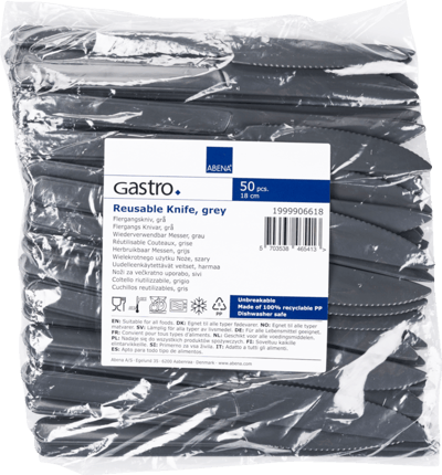 Vores praktiske og robuste bestik i PP kan bruges igen og igen, og er derfor et rigtig godt alternativ til engangsbestik. Knivens stærke kvalitetsmateriale tåler opvaskemaskine, og derudover er PP genanvendeligt ved korrekt affaldssortering. Vi har testet materialet, og flergangsbestikket har bestået 125 vaskecyklusser i henhold til teststandard EN 12875-1:2005. Bestikket er testet i både almindelig vaskemaskine og industriopvaskemaskine med slutskylstemperatur på 81°C.