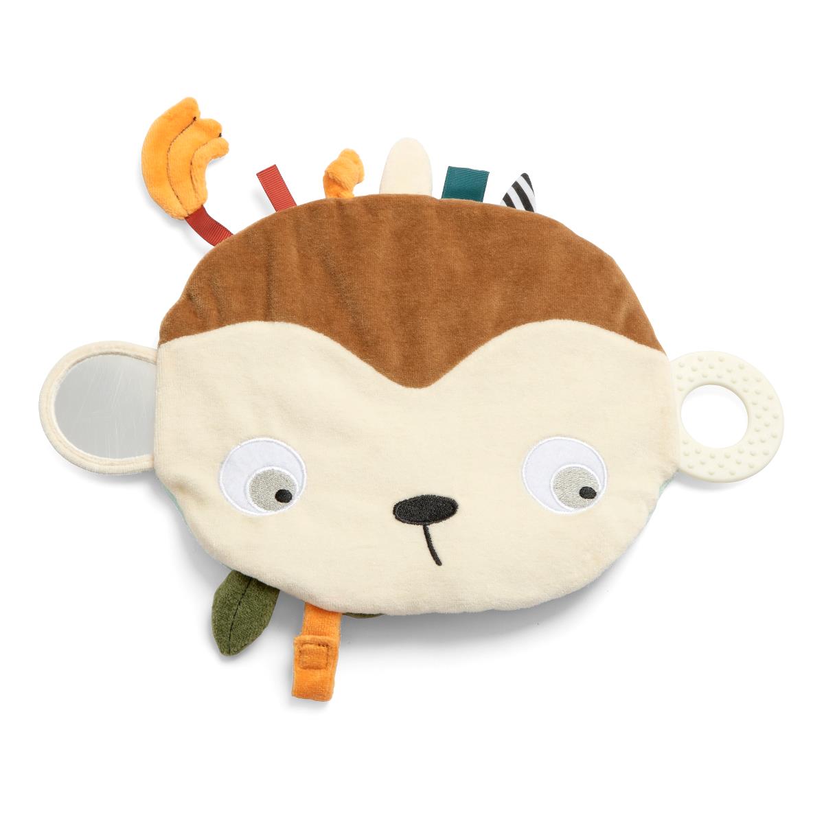 Herlig aktivitetsklud i blødt stof fra Sebra som på den ene side forestiller ansigtet af aben Maci. På den anden side er et lille syet billede af Maci, der gemmer sig på blade. Lad baby opdage og udforske de mange sjove aktiviteter på kluden: knitrepapir, sjove nulrestrimler, babyspejl og bidering med lindrende knopper. Under Macis hoved er er lille strimmel med velcro, hvori babys sut kan hænges i. Kan vaskes i hånden. Husk at fjerne beskyttelsesfilmen fra spejlet, inden du giver legetøjet til barnet. Materiale: 80% bomuld, 20% polyester. Fyld af genanvendt polyester Måler 32 x 32 cm. Fra 0 år Se alle varer fra Sebra