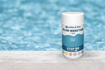 Klor WeekTab (långsamt klor) tillsätts varje vecka för att hålla poolvattnet rent Beskrivning Klor WeekTab-tabletter används för att upprätthålla en lämplig klorhalt i vattnet så att det alltid hålls rent och friskt. Klor WeekTab-tabletter är nästan pH-neutrala och stabiliseras mot klornedbrytning från solens UV-strålar. Beroende på aktivitet och väderförhållanden ska nya tabletter tillsättas cirka en gång i veckan. Den omgivande miljön kan variera kraftigt och påverkar då vattnet i poolen. Det rekommenderas därför att man periodvis använder Klor Starter-granulat (1701). Vattnet hålls desinficerat vid en klorhalt på 0,5 - 1,0 mg/l. Klorhalten bör pluus.seas kontinuerligt med Swim & Funs pluus.seremsor (1537). Klor WeekTab-tabletter levereras i en praktisk plastbehållare med barnsäkert lock. Behållaren är märkt med detaljerad bruksanvsning på de nordiska språken och engelska. Dosering: Tillsätt en tablett per 20 000 liter vatten. När tabletterna har lösts upp till 10 % av normalstorleken tillsätts nya tabletter. Placera alltid tabletterna i en flytande klordispenser eller i poolens skimmer. Observera att klorförbrukningen kan variera beroende på vattnets temperatur, hur länge och hur ofta man badar och vädret. Friskt poolvatten har ett pH-värde mellan 7,0 och 7,4. Med en hälsosam vattenbalans får du den bästa nyttan med vattenvårdsprodukter. Om poolvattnets pH-värde inte varierar mellan detta intervall justeras det med pH-Plus respektive pH-Minus. Observera att klorförbrukningen kan variera beroende på vattnets temperatur, hur länge och hur ofta man badar och vädret. Se till att kemikalierna inte blir fuktiga under förvaring. Förvaras i originalförpackning, låst och otillgängligt för barn, samt torrt, frostfritt och inte i direkt solljus. Biocider bör användas med försiktighet. Läs etiketten och bruksanvisningen innan du använder produkten.