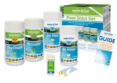 Med ett startpaket för poolvård är du säker på att komma igång med badsäsongen. Paketet innehåller alla de vattenvårdande artiklar som behövs för att hålla vattnet i poolen rent och inbjudande, samt en tydlig och informativ guide. Paketet innehåller OxyChock för desinficering av vattnet. Remsor för att enkelt kontrollera pH-värde och aktiv syre nivå. PH Plus/Minus för att justera pH-nivån och Aktivator som förlänger och ökar den desinficerande effekten. OxyChock granulat används för klorfri chockbehandling av badvattnet vid driftsättning av poolsystemet, underhåll och vid eventuellt problemvatten. Det går att bada igen relativt snabbt efter tillsättning. För att upprätthålla desinfektionen används OxyChock i kombination med Aktivator, som förlänger och höjer desinfektionseffekten från det aktiva syret markant. Pool pluus.seremsor används för att snabbt och enkelt mäta vattnets pH-värde och klorhalt. Resultatet kan enkelt avläsas på behållaren. För högt pH-värde (hårt vatten) justeras med pH Minus och för lågt pH värde (mjukt vatten) justeras med pH Plus. Det idealiska pH-värdet är mellan 7,0 och 7,4.
