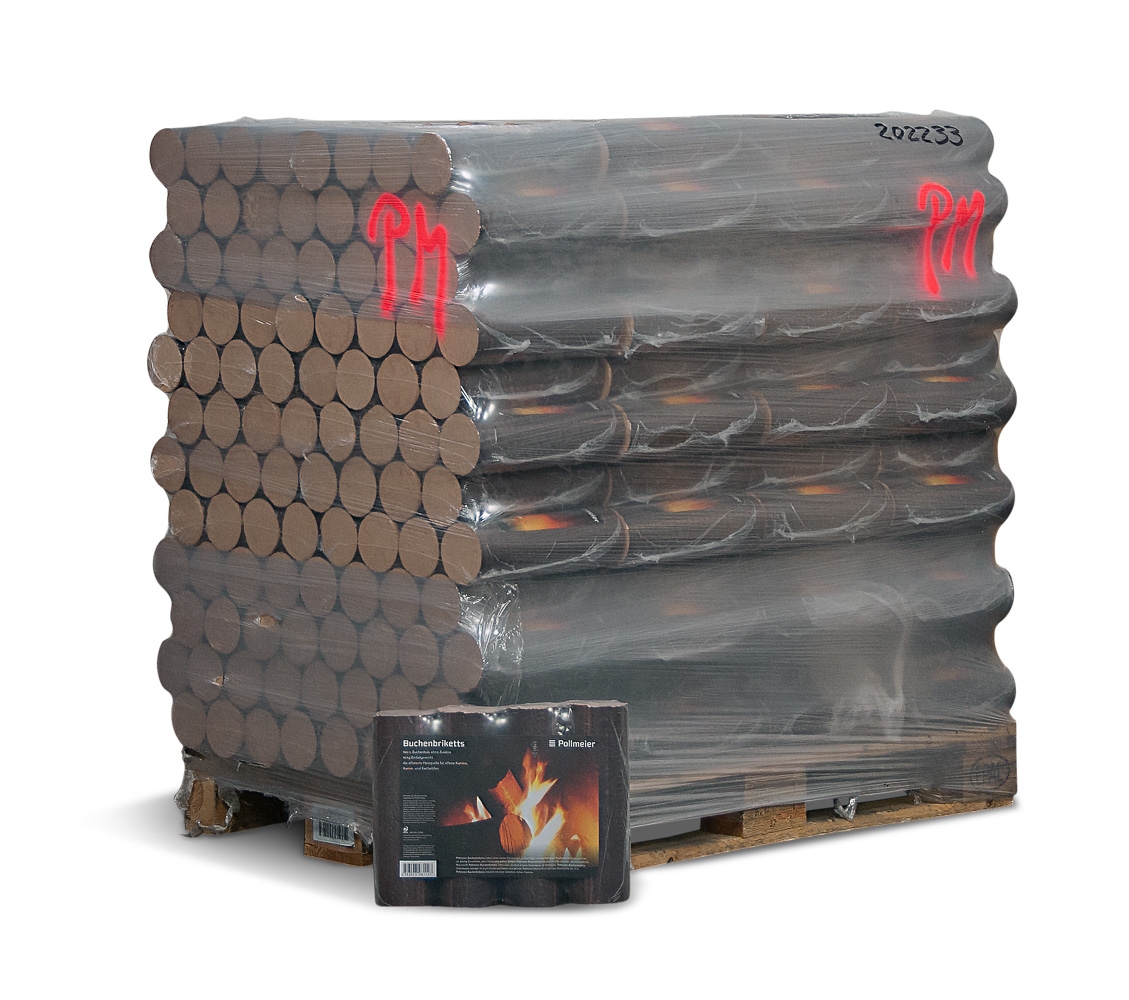 Deluxe Bøgebriketter - tysk superkvalitet Indeholder 96 pakker a' 10 kg Deluxe Bøgebriketter er briketter af allerfineste kvalitet - fremstillet af bøgesavsmuld i Tyskland. Effektiv brændværdi: ca. 5200 kcal/kgDe er pressede og de smuldrer stort set ikke, hverken i pakkerne eller ved håndtering. Briketterne er nu endnu hårdere presset end før og en smule større. Derfor er der nu 4 store briketter i hver pose á ca. 10 kg.Briketter måler ca. Ø10x 29cm. Briketterne er aflange, men kan nemt knækkes over og kan således bruges også i mindre brændeovne.Briketterne danner under 0,9% aske og meget lidt sod ved afbrænding.Under afbrænding udvider briketterne sig i længden. Sørg derfor for at de ikke ligger for tæt på ovnens kanter og rude. Fordele ved briketter, bøgebriketter Det er oftest billigere at fyre med briketter end almindelig brænde, hvilket primært skyldes, at fugtighedsgraden er lavere i briketter. Træet i Deluxe Bøgebriketter er rent bøgetræ - altså hårdttræ. Der er tale om restprodukt fra anden produktion briketterne er dermed CO2-neutrale. Bøgebriketter fylder mindre en kløvet træ og er altid klar til brug ved levering. Opbevaring af Deluxe Bøgebriketter Bøgebriketter bør opbevares tørt - helst indendørs, i et skur, garage eller carport.