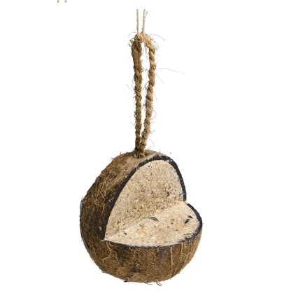 Kokosnød fyldt med fedt til vildtfuglene i haven.