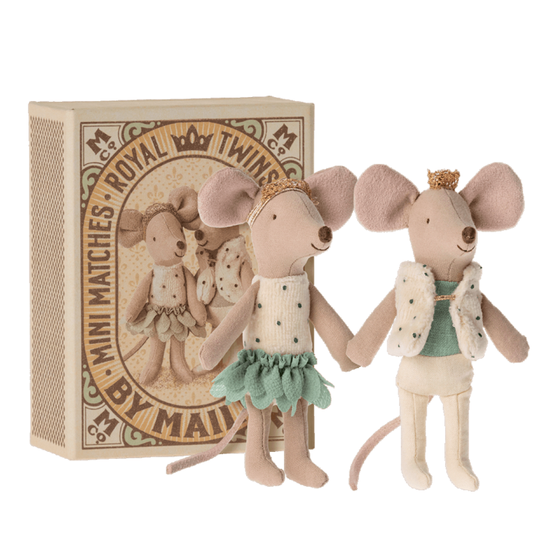 Den kongelige musefamilie bliver udvidet med disse fine royale tvillinge. Musene leveres i en pæn dekoreret tændstik-lignende æske, der også fungerer som seng, hvor de kan puttes. De er klædt i deres gyldne kroner og smukke tøj. Musene er en del af Mailegs meget populære serie af søde mus med et strejf af humor, som er blevet kendt og elsket i hele verden. Materiale: Bomuld, hør og genanvendt polyester Måler: 11 cm. Fra 3 år