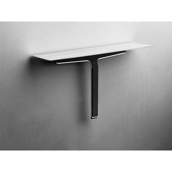 Sæbehylde med magnetisk ophæng til bruseskraberen. Hylden er produceret i forstærket stålplade med spor, der dræner vandet af pladen. Rundt i kanten er lasergraveret en tynd ”antislip” barriere, som hjælper med at shampoo og andre badprodukter ikke glider af hylden, når den er våd. Bruseskraberen består af to dele – et højkvalitets silikoneemne båret i en forstærket stålramme. Skraberen er monteret med silikone bumpere i enderne, hvilket beskytter fliser og andre overflader mod skrammer.