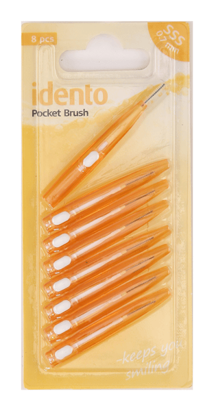 Idento Pocket Brush er til folk med lidt større mellemrum mellem tænderne. Pocket Brush virker som en ”flaskerenser”, hvor man renser mellem tænderne skånsomt med de små børster, som er på Pocket Brush. Pocket Brush er designet således, at den skubbes op af hylstret, og efter brug trækkes den ned i hylstret igen og kan dermed genbruges. Pocket Brush findes i 3 forskellige størrelser markeret med 3 forskellige farver. Grøn: 0,7 mm Blå: 0,8 mm Gul: 1,0 mm