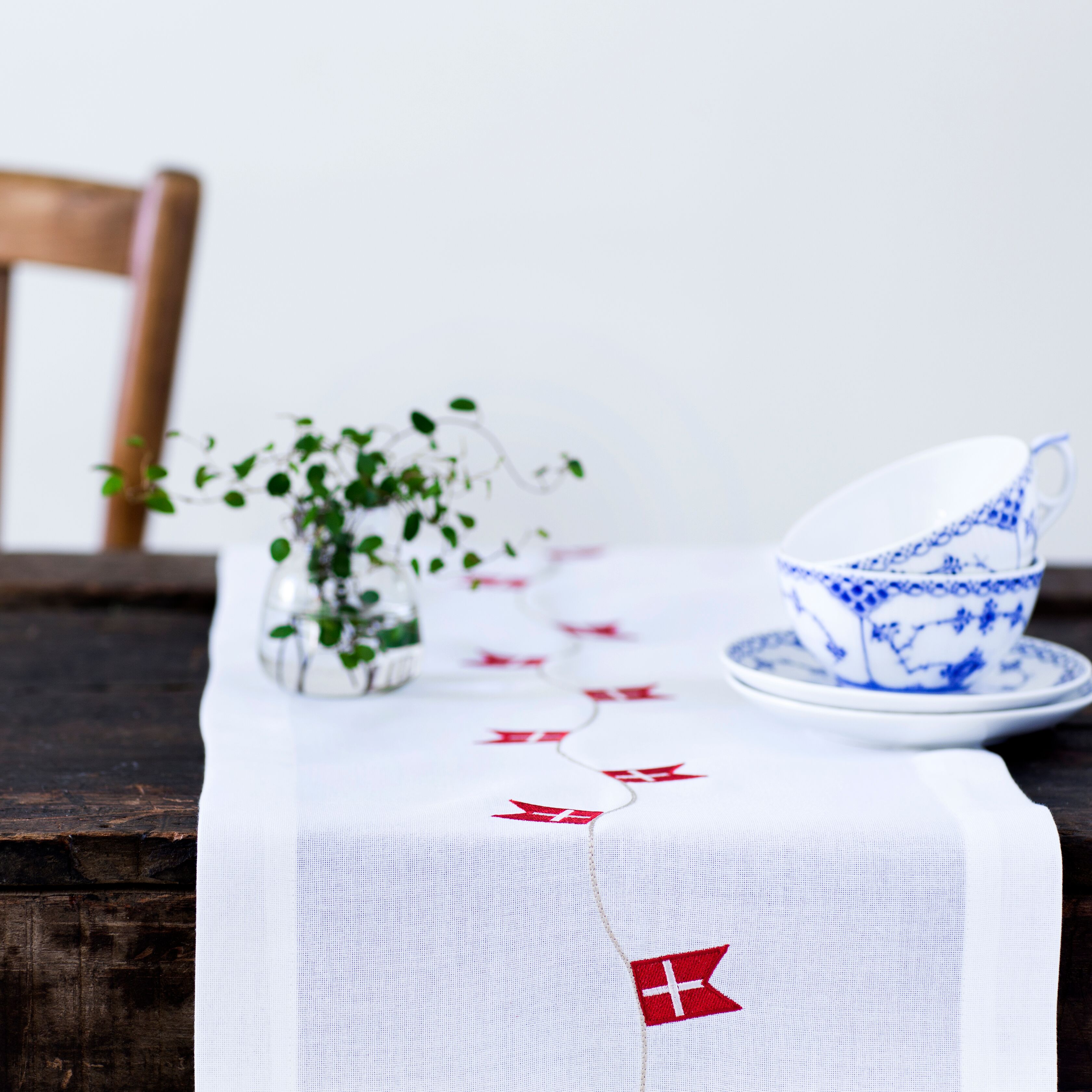 Flot og klassisk bordløber syet i ægte flagdug med broderede dannebrogsflag fra vores eksklusive designserie Nordic Way of Celebration. Med denne flotte bordløber kan du nemt og enkelt pynte et smukt fødselsdagsbord eller brug bordløberen til andre festlige lejligheder såsom jubilæum, studentergilde, barnedåb eller lignende. Bordløberen måler 30 x300 cm og er syet i ægte, hvid flagdug. Kan vaskes ved 60 grader. Krøller meget lidt. IDE: Brodér selv familiens navne og fødselsdage på bordløberen - se billede.