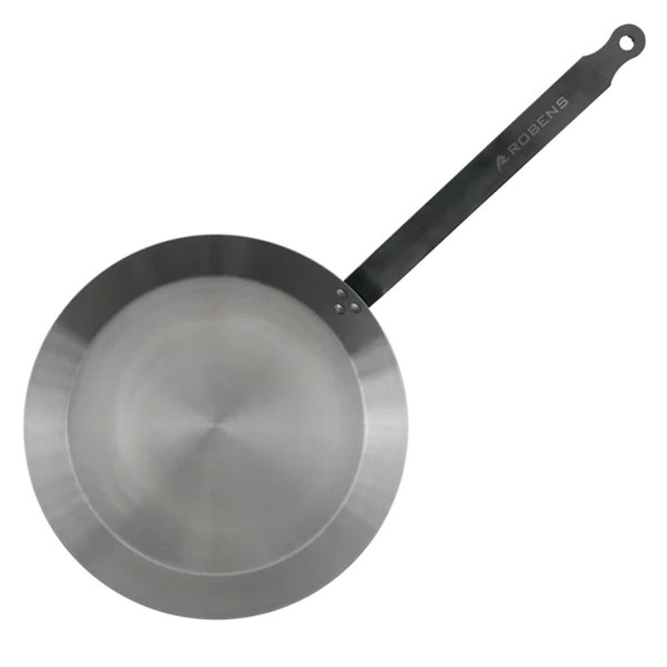 Fremstillet i pladejern, 30 cm i diameter, Højde på 5 cm, Praktisk langt håndtag, Vægt: 1400 g., Praktisk pande til brug over bål eller friluftsovn. Er fremstillet i pladejern, dette får patina og mørkner med tiden. Jævn varmefordeling og solidt langt håndtag. Leveres med beskyttelsespose.