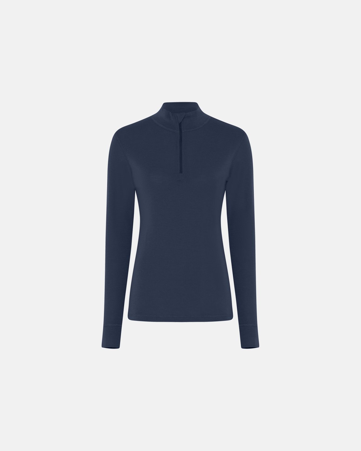Langærmet trøje med lynlås som er syet med flade sømme for en bedre komfort. Trøjen er i farven navy, har en høj hals og er fremstillet ud af 100% merinould, som giver dig en trøje som er temperaturregulerende, isolerende og antibakteriel.