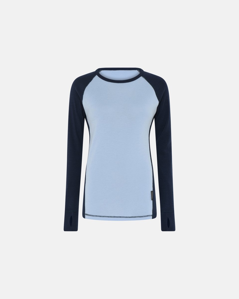 Langærmet t-shirt fremstillet i blødt og behageligt merino uld, oplagt til brug som det inderste lag så du kan holde varmen i de kølige tider. Trøjen er i en flot dueblå farve, med mørkeblå ærmer, er fremstillet med flade sømme, og er med forlængede ærmer med hul til tommelfingerne.