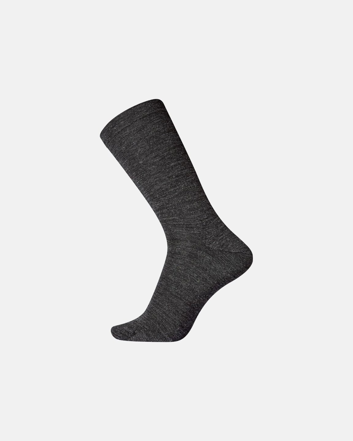 Den klassiske "Twin" strømpe fra Egtved uden elastik i mørkegrå meleret. 2-lags strømpe med blød bomuld indvendig, og varmeregulerende uld på ydersiden. Strikket uden normal elastik i toppen, som formindsker problemet med blodomløbet i benene. Findes i størrelserne 40-45 og 45-48.