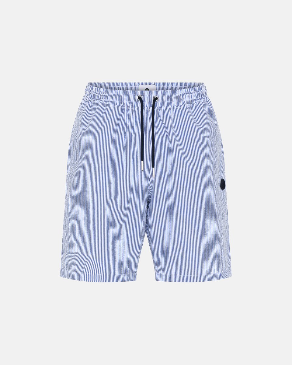 Pyjamas shorts i et flot blåstribet mønster. De er syet i et "Bæk og Bølge" (på engelsk kaldet "seersucker") tekstil, der har en ekstra dimension af blødhed over sigt.
