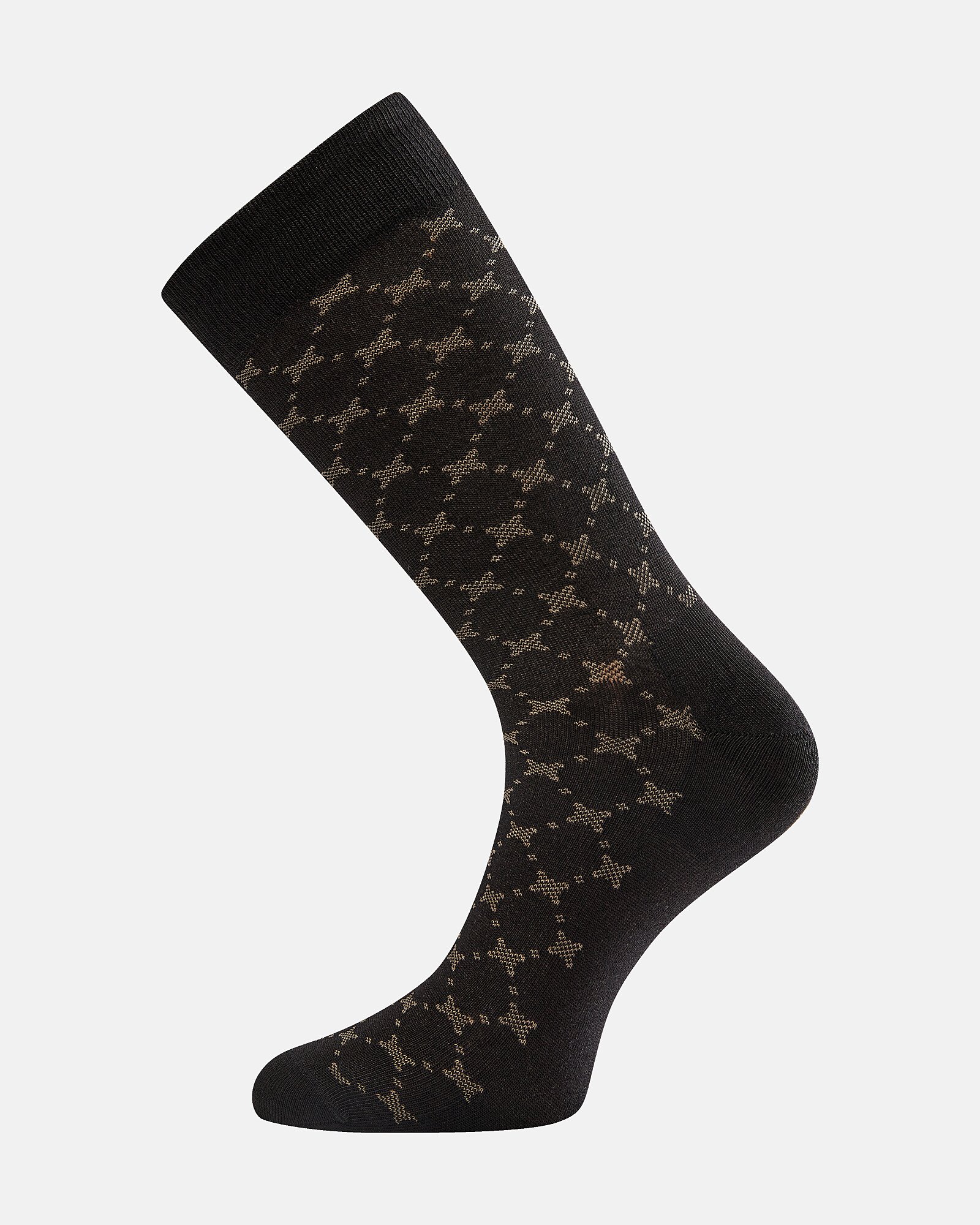 Egtved, grundlagt 1931, præsenterer en herrestrømpe i bambusviskose, designet til komfort og langvarig brug. 71% viskose (bambus) og 29% polyamid giver en blød, åndbar kvalitet med god holdbarhed. Sort bund med beige krydser og prikker skaber et diskret, dekorativt mønster. Ribbet elastik øverst sikrer, at strømperne bliver på plads uden at stramme. Billedet fremhæver tekstur og tykkelse, som gør dem velegnede til daglig brug og klassisk herrestil.