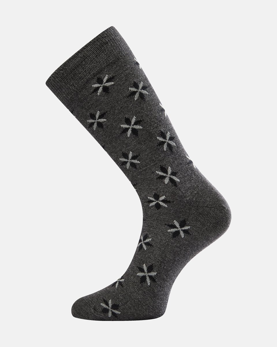 Egtved har siden 1931 fremstillet strømper med fokus på kvalitet, funktion og klart design. Disse ankelstrømper i mørk grå melange er strikket i 71% viskose (bambus) og 29% polyamid, hvilket giver en blød og åndbar overflade med god glans. Mønsteret af stjerneformede figurer i lysere og mørkere toner skaber en diskret kontrast til den grå baggrund. Ankelhøjden og den elastiske afslutning sikrer en behagelig pasform uden at stramme. Kombinationen af bambusviskose og polyamid giver komfort hele dagen samtidig med øget holdbarhed og formstabilitet. Den neutrale baggrund fremhæver strikkets struktur og detaljerne i mønsteret.