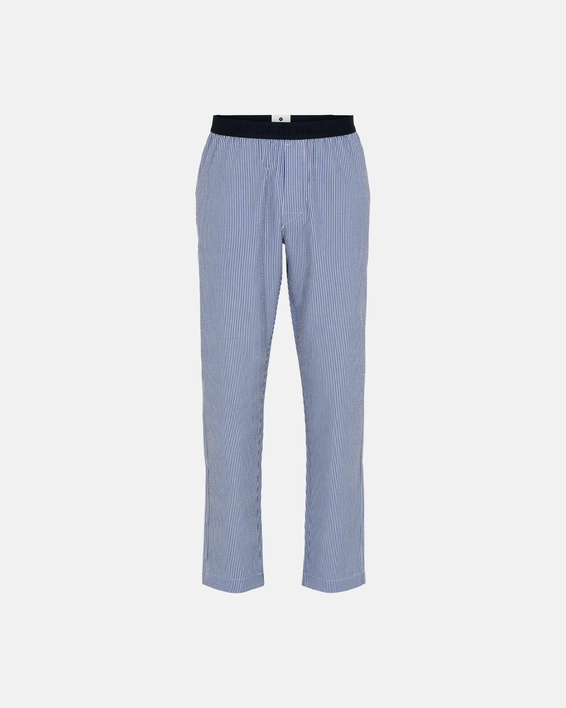 Pyjamas bukser i et flot blåstribet mønster. Seersucker eller bæk og bølge er et bølget bomuldsstof, som er utrolig behagelig og let at have på Denne vare skal helst være for lang på ben/ærmer før vask, da den typisk vil krympe 5-8% i ben/ærme-længde. (Ved strygning kan der oftest hentes et par centimer igen.)