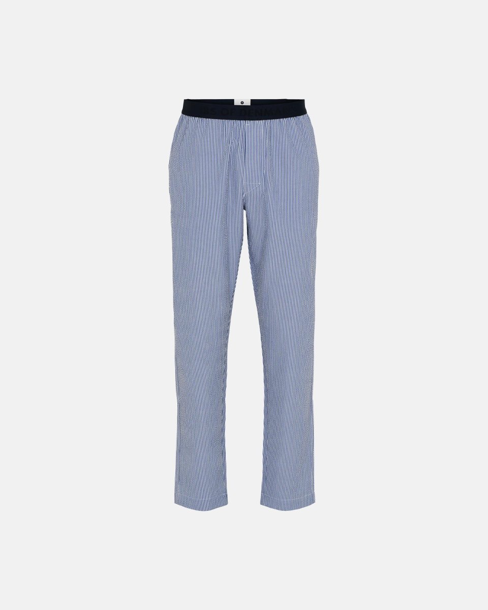 Pyjamas bukser i et flot blåstribet mønster. Seersucker eller bæk og bølge er et bølget bomuldsstof, som er utrolig behagelig og let at have på Denne vare skal helst være for lang på ben/ærmer før vask, da den typisk vil krympe 5-8% i ben/ærme-længde. (Ved strygning kan der oftest hentes et par centimer igen.)