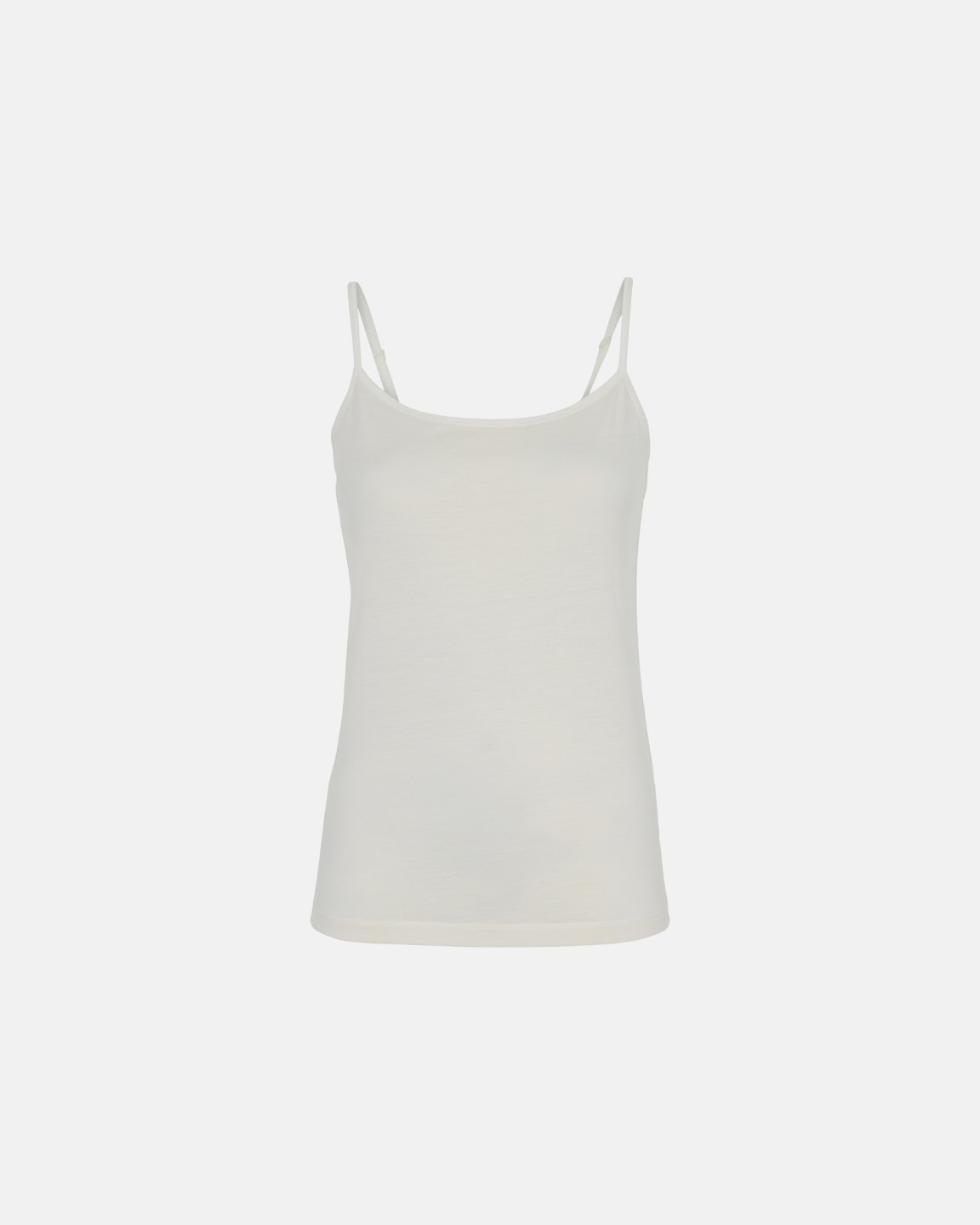 Delikat og funktionel top med smal strop, lavet af en unik blanding af organisk uld (60%), bambus-viskose (30%) og silke (10%). Ulden er absorberende, isolerende og temperaturregulerende, mens kombinationen af silke og bambus-viskose gør materialet ekstremt blødt og let.