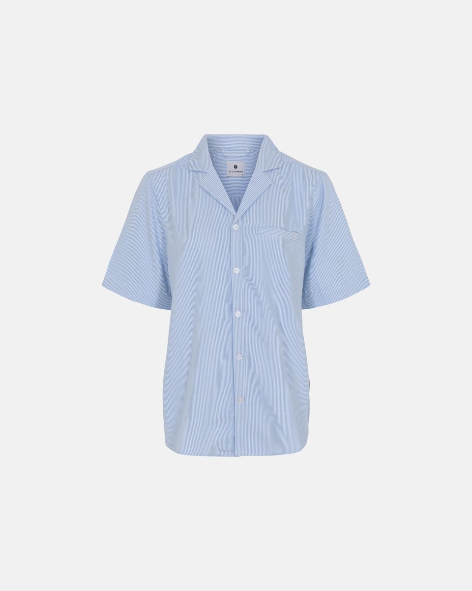Blød bambus pyjamas skjorte med kort ærme i et smukt blå stribet mønster. Dette produkt er FSC®-certificeret. FSC®-certificeringen garanterer, at materialerne kommer fra ansvarligt skovbrug og andre kontrollerede kilder. Desuden sikrer certificeringen, at dyr og planteliv er beskyttet, og at der er passende betingelser for de mennesker, der arbejder med dyrkning af bambus. Denne vare skal helst være for lang på ben/ærmer før vask, da den typisk vil krympe 5-8% i ben/ærme-længde. (Ved strygning kan der oftest hentes et par centimer igen.)