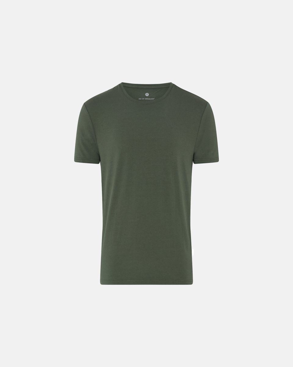 Grøn bambus T-shirt fra JBS of Denmark med rund hals. Du kan bruge denne T-shirt om undertrøje eller en lidt mere stramtsiddende T-shirt. Kompositionen med 65% bambus og 30% økologisk bomuld, giver en rigtig blød T-shirt, som er behagelig at have på hele dagen. Mærkatet i nakken er svejset i, så her får du en T-shirt uden generende mærker og syninger. Et premium produkt fra JBS of Denmark.
