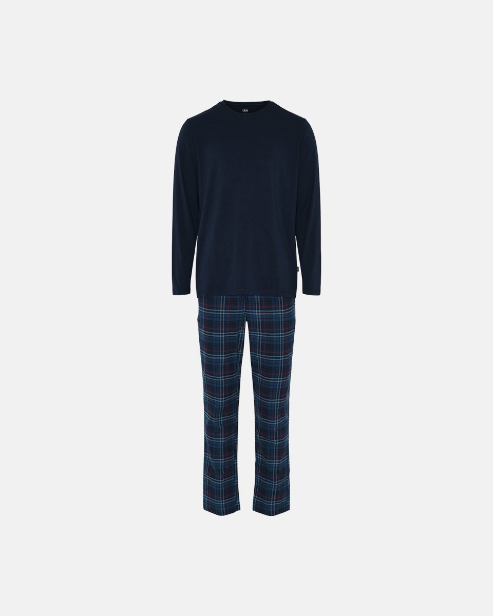 Lækkert pyjamassæt fra JBS. Overdelen som er med rund hals kommer i et lækkert bambusviskose materiale som sikre dig god komfort og åndbarhed, samtidig med at det er silkeblødt. De tilhørende bukser er i flannel(bomuld), og har et flot blåternet mønster, som matcher den navy overdel godt.