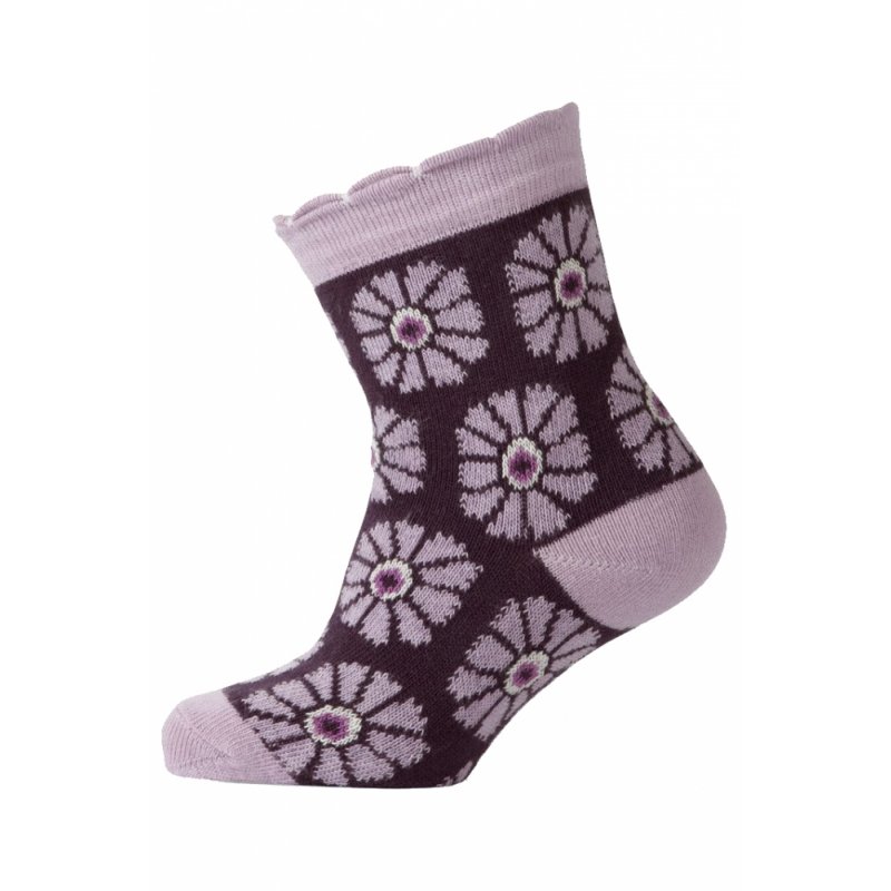 Soklet fra Melton i lilla farve med lavendelfarvede blomster. Sokken er med blondekant øverst og Melton logo under foden. Kvaliteten er 80% bomuld, 15% polyamid og 5% elastan.
