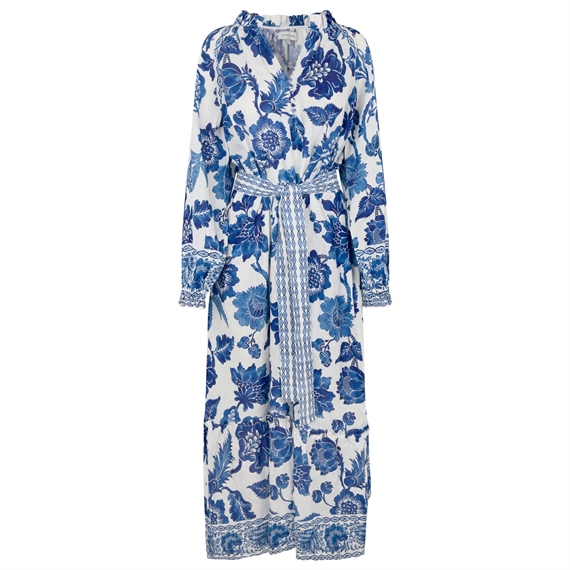 IdaniaDEA Kjole fra Dea Kudibal er en smuk, gulvlang kjole i let hør, dekoreret med store, eksotiske blå blomster, der giver et feminint og eksklusivt udtryk. Den har et regular fit, som let kan formes i taljen med det medfølgende bindebælte. Fine flæsedetaljer langs kraven, små betrukne knapper samt kontrastkanter ved ærmer og kant fuldender det elegante look. Kjolen leveres med underkjole for ekstra komfort og et smukt fald. En perfekt kjole til både sommerens begivenheder og særlige anledninger.