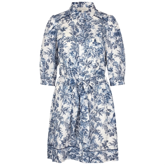 Denne MaryDEA er en charmerende skjortekjole med et smukt botanisk print. Kjolen er fremstillet i hør og slutter lige over knæet. Der medfølger et bælte i samme stof til at markere taljen. Kjolens kontrastpiping ved søm og skuldre tilføjer en luksuriøs detalje.