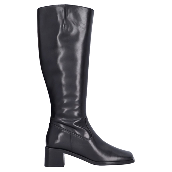 Håndlavet langskaftet støvle, udført i sort glat skind med firkantet tå. Støvlen har en lynlås på indersiden og en medium blok hæl. En klassisk og elegant langskaftet støvle.
