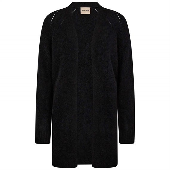Elegant, lang cardigan i en klassisk sort farve. Den har en løs og afslappet pasform med et blødt, vamset udtryk. Strikket i en fluffy alpaka- og uldblanding, der giver en let og eksklusiv struktur. Perfekt som et stilrent lag til både kjoler og bukser.
